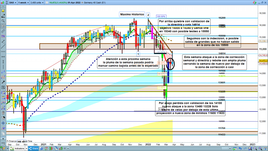 En gráfico semanal del dax40, como siempre imagen muy clara de la situación. La semana pasada decíamos que había alcanzado el 50%, de corrección de todo el impulso de la bajada, desde máximo histórico hasta la zona de los 12411, más concretamente en 12432. Esto nos dejaba abiertos diferentes escenarios, desde ser aun una corrección de onda 4, para acabar primer impulso u onda 1, o estar ya de pleno en onda 2, habiendo cerrado la onda 1 en la zona del 12411 (posible con las proyecciones medidas, aunque el dibujo de la estructura no es claro). La vela con amplia pluma superior de esta semana, no cambia nada, pluma hasta el 61,8%, posible tanto en onda 4 alta como en onda 2 baja. Por tanto, muy atentos a la evolución de este inicio de semana. Solo con cierre de velas de H4, o mínimo de H1 por encima de la cota 14814, coincidente con zona de directriz, nos darían confirmación de tramo final de onda 2 hasta la zona 15000 a 15240, o/y 15350 a 15550. Si, por el contrario, el precio pierde en primera instancia los, 14187, objetivo inmediato 14100 y posteriormente si pierde con cierre de velas los 14100, entramos en diversificación de estructuras que nos pueden llevar a varios objetivos. La perdida de los 14100, objetivo de alta probabilidad, 14000 a 13871. La perdida de esta zona 13871, confirmada también con cierre de velas, abre camino hacia 13601, y hacia 13480 a 13228.
