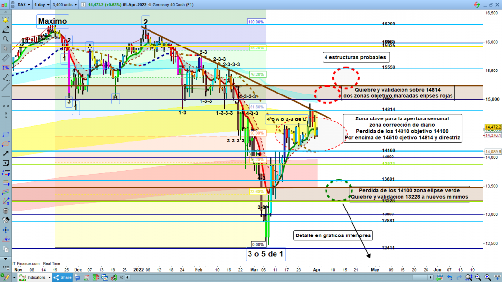 En gráfico diario del dax40, escenario para el medio plazo como cada semana. En el gráfico semanal, veíamos los posibles recorridos después de validaciones en 14814, y en 14100, como es normal, una gran distancia entre ambos, antes de tener validación para operativa. En gráfico diario, vemos las zonas más importantes en el corto y el medio plazo, desde la situación actual del precio en los, 14472, y hasta, o los 14814, o los 14100. Operativa antes de la validación para objetivos más importantes.