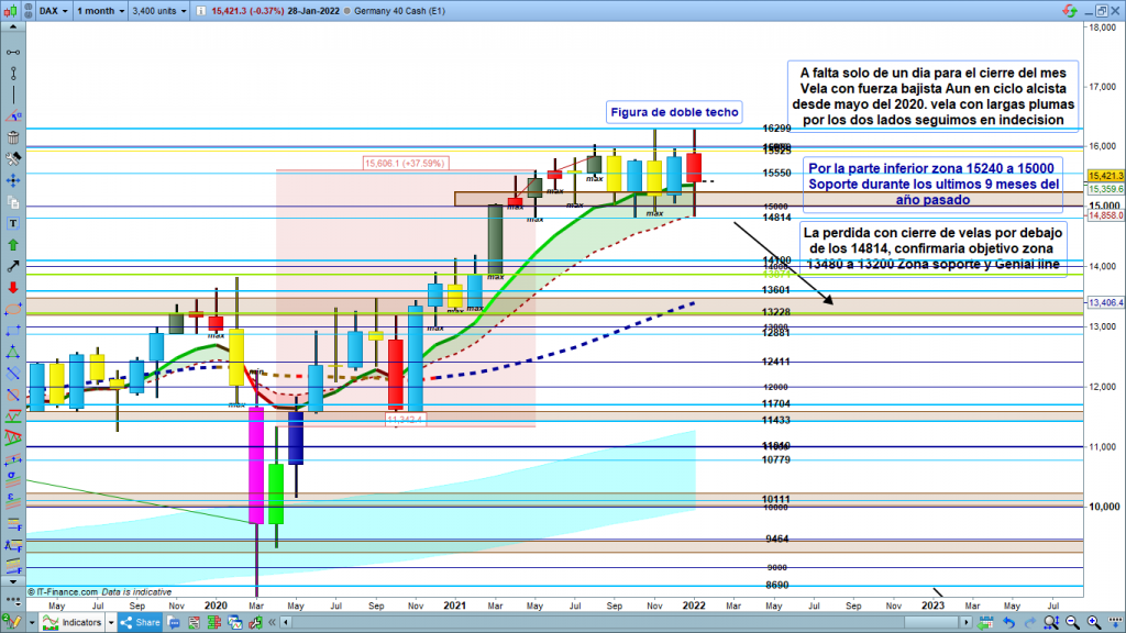 En gráfico mensual del dax40, ningún cambio versus la semana pasada. A falta de un solo día para el cierre del mes de enero, tenemos vela roja con fuerza bajista o correctiva en ciclo alcista que viene de mayo del 2020. Testeo a toda la zona de corrección y cierre de vela posiblemente justo encima de la zona superior de esta zona de corrección. Pese a la entrada de fuerza, de momento vela de indecisión total, esperemos que la vela del mes de febrero nos ayude más en la toma de decisiones.