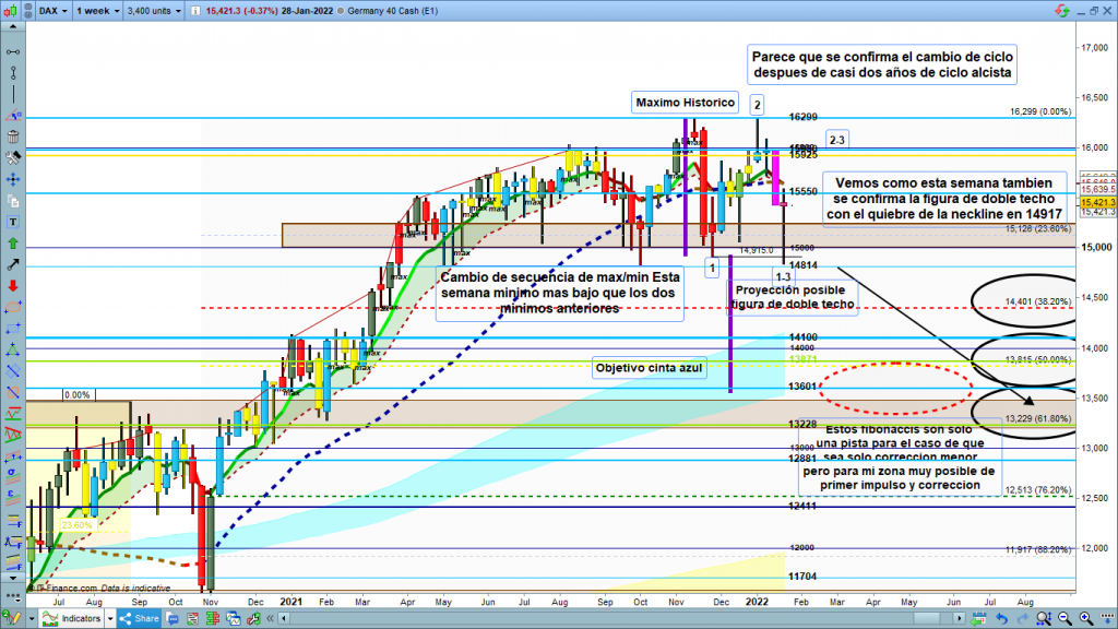 Cambio de secuencia de máximos/mínimos, de alcista a bajista. Vemos como la vela de esta semana, ha marcado un mínimo más bajo que los dos últimos mínimos del mercado en gráfico semanal, esto es importante, ya que es lo que marca la tendencia primaria en curso. Por un lado. venimos de un máximo más bajo, el de la primera semana del año, llego a 16288, pero no hizo nuevo máximo histórico, y ahora esta semana, mínimo más bajo que los mínimos de 29 de noviembre y del 20 de diciembre del año pasado.