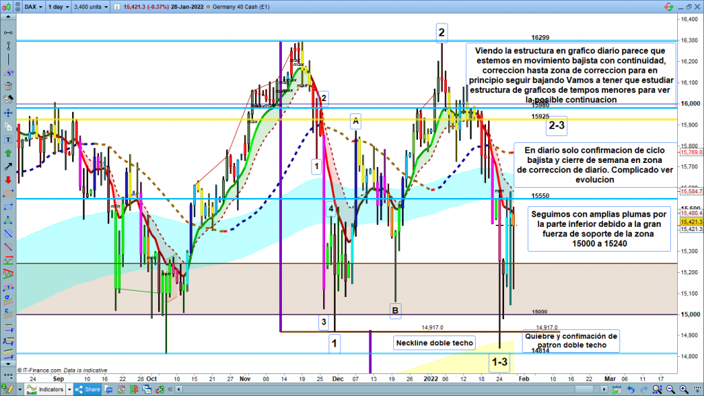 Resumiendo con el estudio del gráfico semanal, todo y el dibujo de la vela, prácticamente todo pluma, los movimientos de esta semana, han sido importantes, validando como hemos visto un más que probable cambio de tendencia desde el 2020, con su rally alcista desde los 7981 a 16299.
