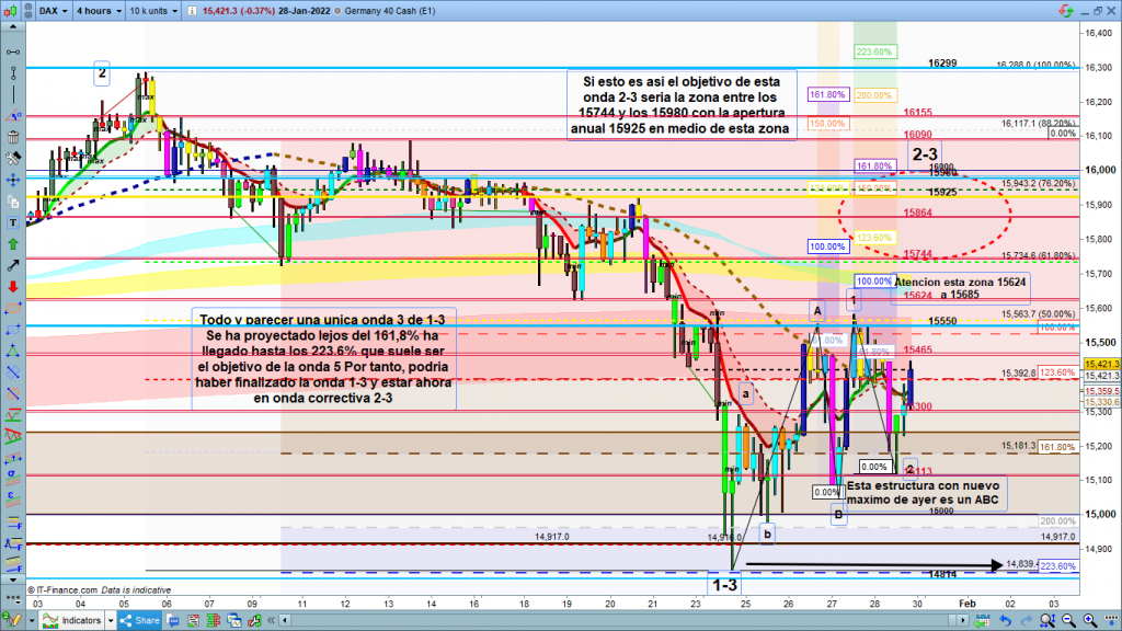 Esto es así porque la estructura que se formó a partir de este punto, con el primer ABC, hasta la cota 15550, era lo que parecía onda 4 para un nuevo impulso con nuevo mínimo y acabar el movimiento. Sin embargo, el movimiento de bajada hasta el 15045, el pasado jueves, y en el siguiente movimiento alcista, sobrepasar el alto anterior que había sido en 15554, llegando hasta los 15584, dibujo una estructura correctiva que solo podría ser de onda 2-3.