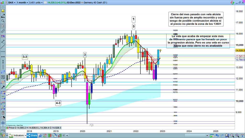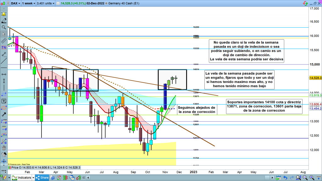 El gráfico mensual del dax40, la imagen es clara, de momento la vela cerrada y dibujada del mes de noviembre, todo y no tener fuerza es una vela alcista dentro de secuencia alcista de gráficos menores. La vela que ha empezado este mes, no es de momento analizable, hasta que cierre el mes pueden pasar muchas cosas, pero de entrada parece que quiere ir a buscar la zona de corrección y Genial line, en la zona de los 13871 aproximadamente. Solo con cierres de velas importantes, mínimo de gráfico diario por debajo de los 13601, validaríamos el final del gran movimiento correctivo alcista de los dos últimos meses.