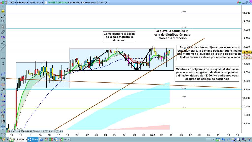 La semana tuvo su apertura en la zona de los, 14503, y al final el cierre de la semana en los 14528, o sea podemos considerar una nueva semana y ya van 2 semanas y media en la zona entre los 14200 y los 14600, rango realmente muy limitado convertido en caja de distribución. Durante la semana, primero bajo hasta los, 14324, en la apertura del martes, después subida hasta los 14606, el jueves en sesión asiática después del rally provocado por Mr. Powell el miércoles a las 20 h. El viernes vela espectacular con los datos de empleo de Usa, entre los, 14586 y los, 14364, vela de máxima volatilidad de más de 200 puntos, justo con la publicación de los datos macro de empleo de Usa, para al final acabar cerrando la semana en la zona de los 14528.