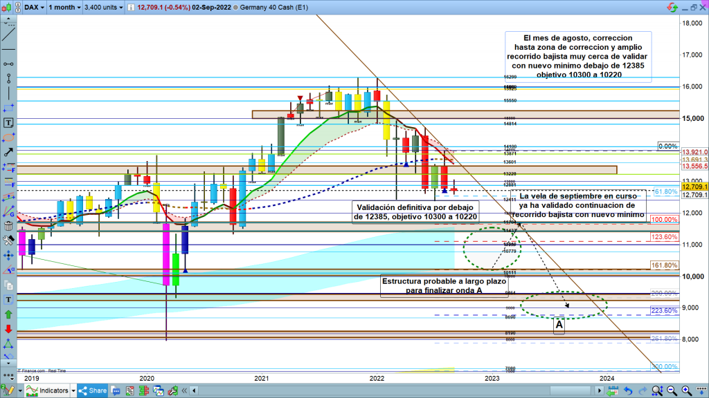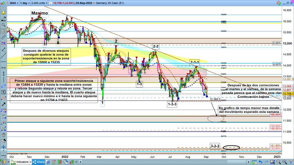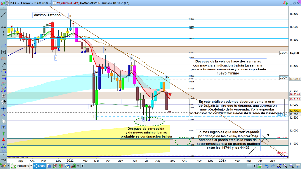 En el gráfico mensual del dax40, la imagen es muy clara. La vela del mes de agosto ha sido importante, ya que subió hasta la zona de corrección de gráfico mensual, y después acabo, cerrando con un importante recorrido bajista con fuerza, hasta la zona de los 12760. Además de esta vela de clarísima indicación bajista, la vela del mes actual, la de septiembre, con solo dos días, ha marcado un nuevo mínimo, marcando la clara continuidad del movimiento. Hemos llegado esta semana pasada hasta los 12600, apenas a 200 puntos de la zona de validación bajista principal. Aunque de momento en gráfico mensual, aun sin esta validación por debajo de los, 12385, todo indica como lo más probable la continuidad del movimiento bajista, además con fuerza.