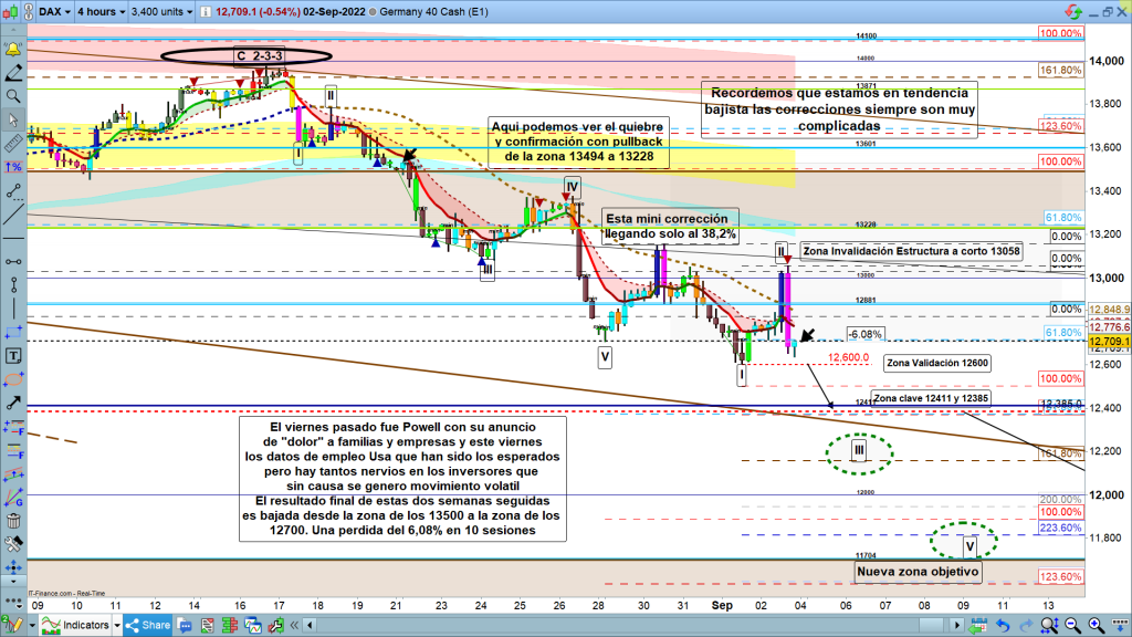 La apertura semanal fue en la zona de los, 12762, y el cierre de la semana ha sido en los, 12709, Como veremos después en el gráfico semanal, vela con amplia pluma y prácticamente sin cuerpo. Después de la importante vela bajista de la semana pasada, esta semana ha sido de descanso con corrección, pero validando camino bajista. Durante la semana, subida de casi 400 puntos hasta los, 13153, el martes, y posterior bajada hasta los, 12600, el jueves, con más de 550 puntos de recorrido, y vuelta hacia la zona de apertura semanal de nuevo en 12762, pero sin llegar. El viernes, día con la volatilidad de la publicación de los datos de empleo de Usa, sin motivo porque el dato final fue casi el del consenso, consenso esperado 300K, dato real, 315K, pero hay tantos nervios en el mercado que al final si hubo volatilidad con movimientos en ambas direcciones. En sesión asiática y sesión europea completa, hasta las 18 h, nueva subida hasta los 13037, y luego bajada de alta volatilidad, hasta los 12634 y cierre de semana ya mencionado en los, 12709. Prácticamente, semana completamente neutral, apenas perdida de 50 puntos en toda la semana, pero con nuevo mínimo y después de la corrección, muy pequeña, por cierto, pero parece clara validación de seguimiento del camino bajista.