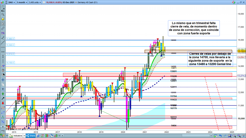 En gráfico mensual del dax40, situación parecida a la del estudio de gráfico trimestral. Después de la vela del mes pasado, con máximo histórico e importante pluma superior, ya cerro dentro de zona de corrección. Este mes en los pocos días de operativa, el precio intento salir de nuevo por arriba, pero al menos de momento no lo consiguió. Si os fijáis, pluma superior con máximo en la cota histórica de los 15500, y de momento está en una situación más baja que el cierre de la vela del mes pasado. Teóricamente, estas próximas dos semanas, a no ser que sigamos en lateral, deberíamos tener recorridos con zonas alcanzadas, que nos dieran pistas más claras de la evolución futura del precio.