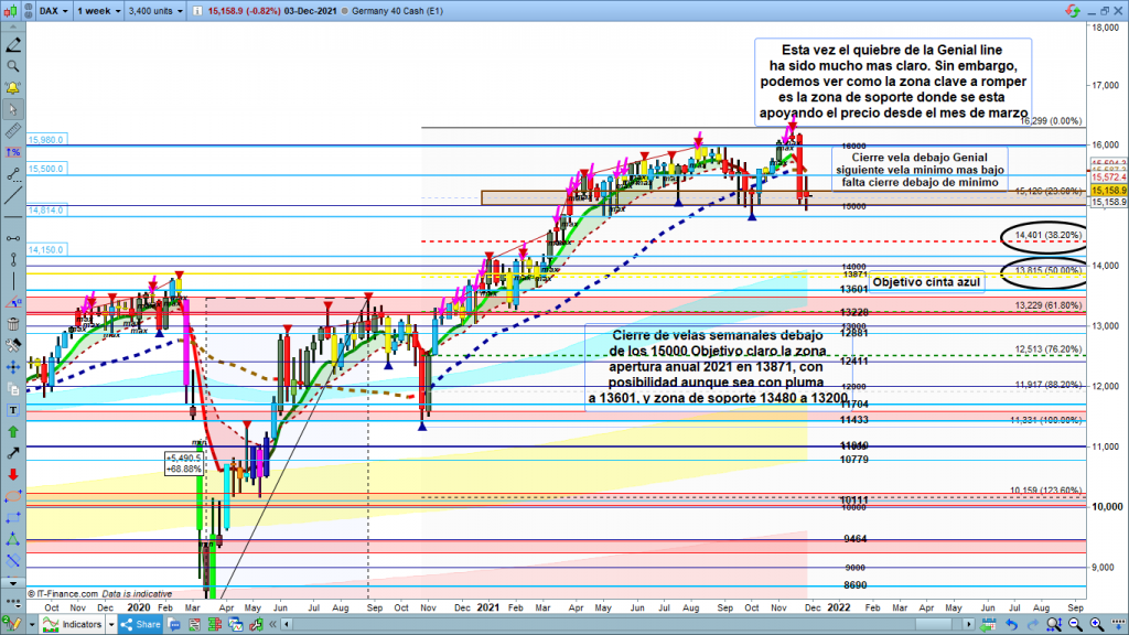 En gráfico semanal del dax40, aquí si con cierre de velas, y con detalle y claridad todo lo que comentaba en gráficos mayores. Aquí si tenemos una visión muy clara de la importancia de la zona de los 15000. Podemos ver como desde el mes de marzo, cada vez que el precio ha llegado a la zona 15240 a 15000, hemos tenido una y otra vez rebotes con nuevos máximos. Aquí es donde tenemos la clave, si el precio rebota de nuevo, y más teniendo en cuenta que no hemos tenido un nuevo mínimo por debajo de los 14814, con un nuevo alto sobre los 15510, posible recorrido alcista de cierta entidad. Solo la perdida de los 15000, con cierres de velas de semanal, o con un nuevo mínimo con cierre de velas debajo de los 14814, daríamos por finalizado el rally alcista y buscaríamos el objetivo de la apertura anual en los 13871.