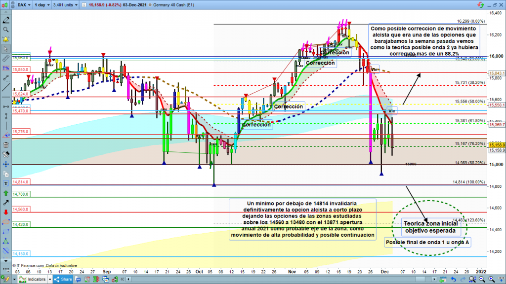 Al no poder determinar si en impulso o solo corrección, mucha atención a las diferentes zonas SoR. En caso de ser únicamente corrección las zonas 15624, los 15730 a 15760, los 15890 a 15925 y los 16000. En caso de seguir el rally alcista con un nuevo máximo sobre el máximo histórico en los 16299, estaríamos en impulso con objetivos posibles en 16750, y 17300.