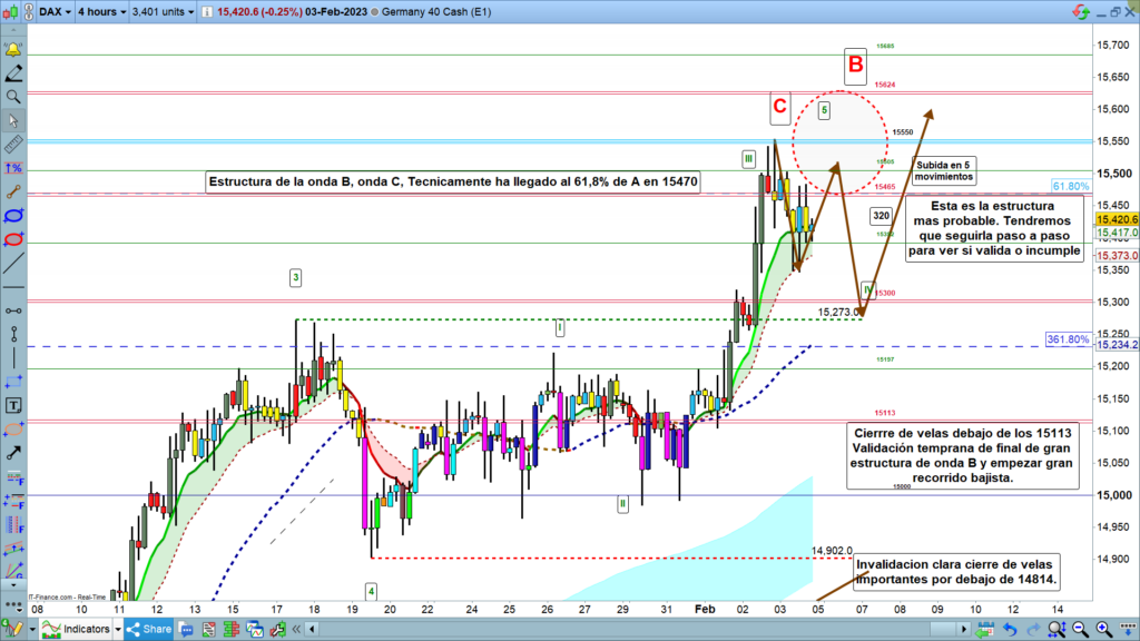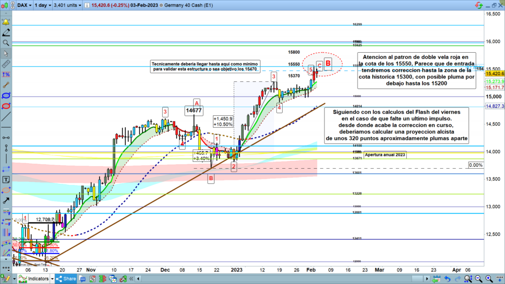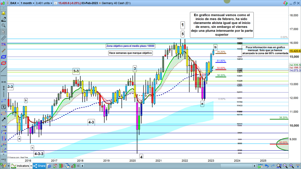 En gráfico mensual del dax40, muy poca información, cierre del mes pasado en la zona esperada, e inicio del mes de febrero, con rally alcista importante, justo hasta la zona esperada. En gráficos menores miraremos la estructura dibujada, a ver si podría haber ya finalizado toda la gran estructura desde octubre, o todavía le faltaría un último movimiento.