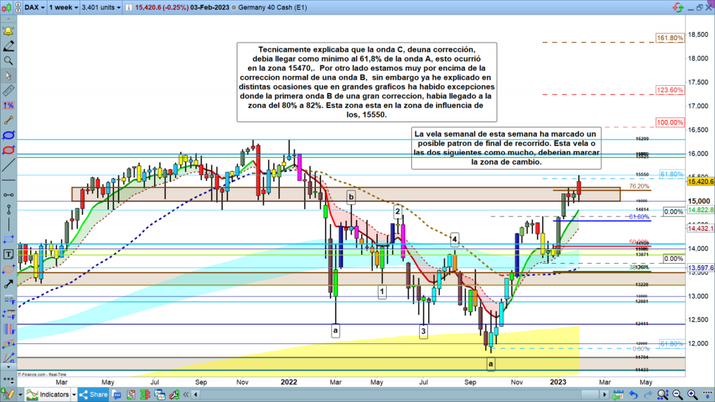 En gráfico semanal del dax40, es donde vemos los detalles más importantes de la situación actual. Lo primero que tenemos que tener en cuenta, es que, técnicamente, para ser una onda B, esta onda C, tenía que cubrir como mínimo el 61,8% de la onda A, la zona donde se cumplía esta situación era, los, 15470, ya alcanzada el pasado jueves. Por tanto, técnicamente en estos momentos ya hemos validado la posibilidad de que sea una onda B.