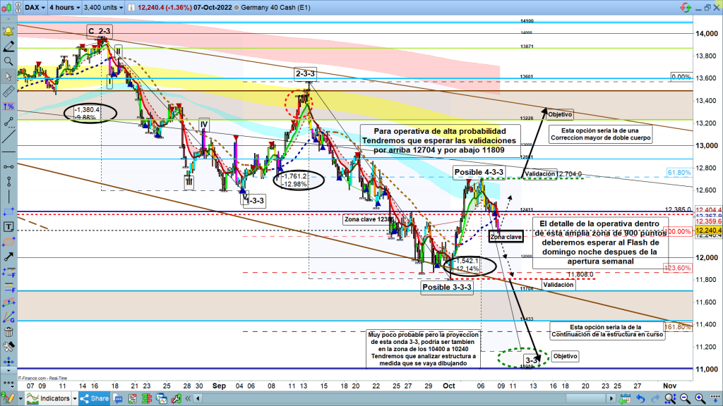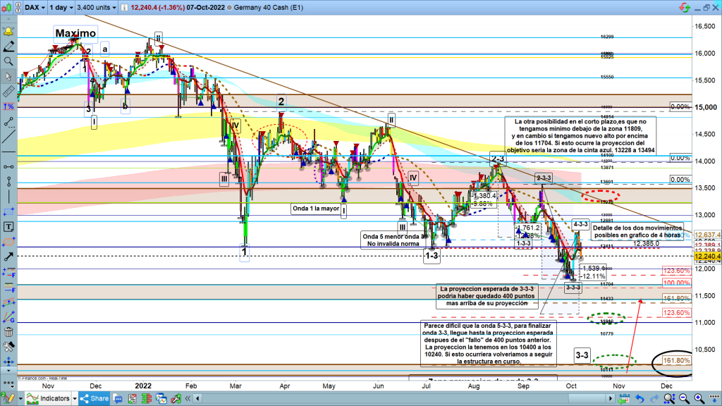 En el análisis de la semana pasada, ya explicaba que la directriz de medio plazo, que viene de principios de enero del 2022, podría ser la protagonista. Decía, que lo normal y más probable es que la onda 3-3-3, finalizara en la zona de los 11433, pero que mucho cuidado con la directriz que podría frenar el recorrido y darnos una corrección anticipada, el objetivo de esta corrección lo situaba en la zona de los 12411, 12578 y 12600. Todo y lo poco probable que se veía este movimiento la semana pasada, al final ha resultado ser el movimiento de la semana. Podéis leer esta proyección en, Análisis general del dax 2 octubre 2022. en el post del estudio debajo del gráfico de 4 horas.