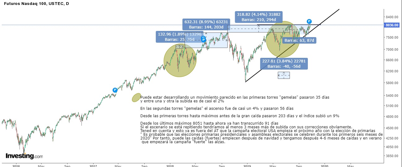 En el gráfico explico una de las posibilidades y es que repita patrón que busque otros máximos históricos como los vistos el año anterior. Y si es así, podríamos entrar en un lateral de 300-500 puntos entre 8200-7700 aproximadamente. Hay que estar atento si lo repite.