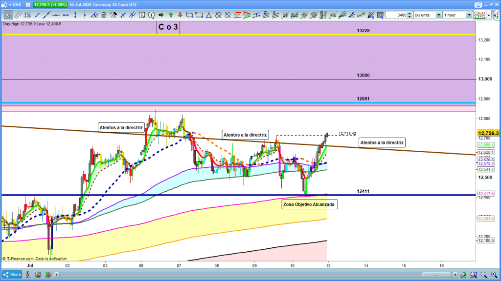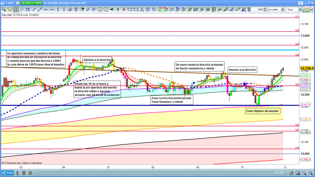 La semana pasada pese a parecer que la cotización dax se iba directo al cielo, ya comente que para mí lo más probable era una corrección hasta la zona del 12411. También decía en la operativa de más corto plazo, que deberíamos tener mucha atención a la directriz de gráficos importantes, pero muy nueva, entre el máximo histórico del mes de febrero de este año y el máximo de hace ya un mes y que podría ser importante en la evolución de la operativa de esta semana.