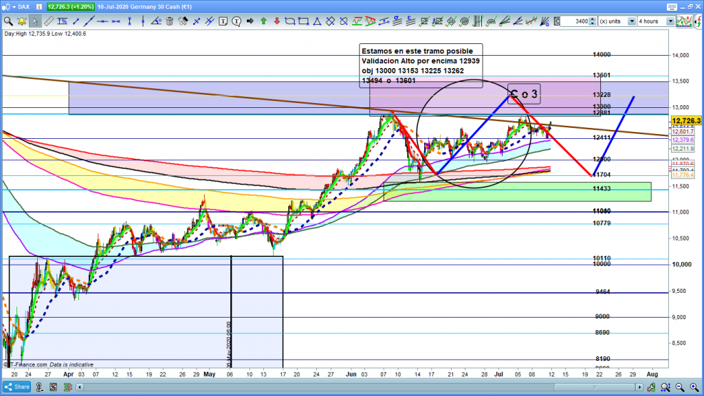 Solo superando y validando 12881, con claridad, después de hecha al menos una corrección, podremos dar esta etapa de consolidaciones sobre la directriz como acabada y la validación definitiva con un nuevo alto por encima de 12938. Validación clara para los objetivos comentados, ya sé que son varios y con un amplio diferencial entre el primero y el ultimo de 600 puntos, pero es que dependiendo de cual es la estructura, de si es final de B, final de onda C de B mayor, o de si es final de onda 3 de impulso de ya esta posible última onda 5 desde el nacimiento del Dax, y sobre todo de la fuerza o volatilidad que tengamos en esta zona del final de este movimiento, podría ser más cerca de los 13601 o más cerca de los 13000. Lo de siempre zona de posible cambio de dirección, lo mejor fuera del mercado, o toma constante de parciales para asegurar el trade. Sea como sea después de este máximo en la zona comentada tendremos un nuevo recorrido hacia la zona de los 12000 a 11800, con posible pluma a 11704. El gráfico semanal esta también en agotamiento en fase final de impulso y pendiente de corrección o cambio de dirección las próximas semanas. solo al llegar a la zona del 12000 a 11704, empezaremos a tener claro si habremos acabado onda 3, corrección de onda 4 a 12000 a 11704. y ultimo impulso para onda 5 de 5 hasta los 15150 a 15500, o en cambio la zona del 13000 a 13601, ha sido final de onda B, y estaríamos en una gran y profunda bajada.