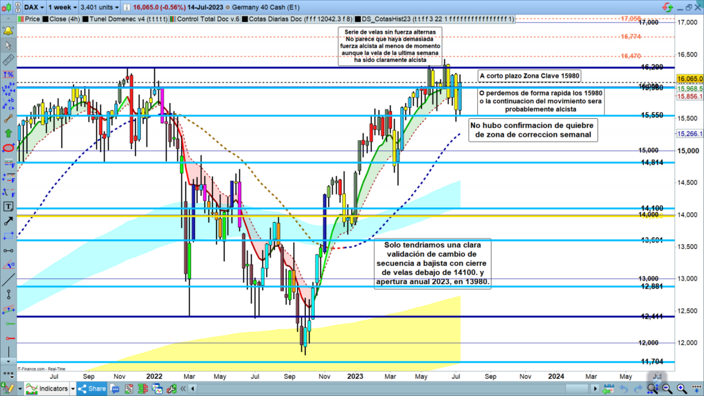 Esto, unido al dibujo de la serie de velas sin fuerza y además alternas, puede indicar dos caminos muy claros. El primero de ellos es si el precio pierde la zona de la cota histórica de los, 15980, lo más probable es que de nuevo tengamos otra vela alterna y esta semana sea otra semana bajista. Si el precio no consigue quebrar y confirmar quiebre de la cota histórica importante de los,15980, cuidado porque entonces podríamos quedarnos al menos los primeros días de la semana, entre la zona de esta cota histórica y la zona de la cota histórica ya alcanzada la semana pasada en los 16155.