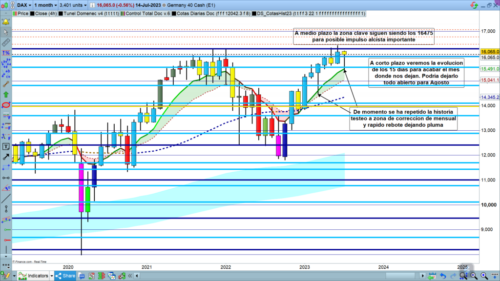 A corto plazo, ya se ve claramente que la zona clave va a ser la cota histórica importante en la zona de los, 15980, como veremos en gráficos de temporalidad menor, sólo el quiebre y confirmación de quiebre de esta cuota histórica importante podría abrir caminos bajistas, aunque de momento parecen ser en forma de corrección.