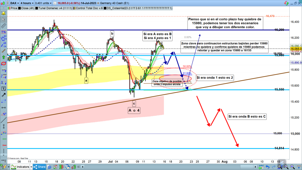 En gráfico de 4 horas del Dax40, dibujo de todo lo explicado hasta ahora, cuáles pueden ser las dos estructuras posibles, corrección ya finalizada y estar en posible nuevo impulso alcista, o, por el contrario, haber finalizado solo las dos primeras partes de una corrección mayor o de doble cuerpo. En este caso, el escenario de esta semana y posiblemente también de las siguientes, sería camino bajista hasta la zona ya comentada en este análisis de los, 15000 a 14814.