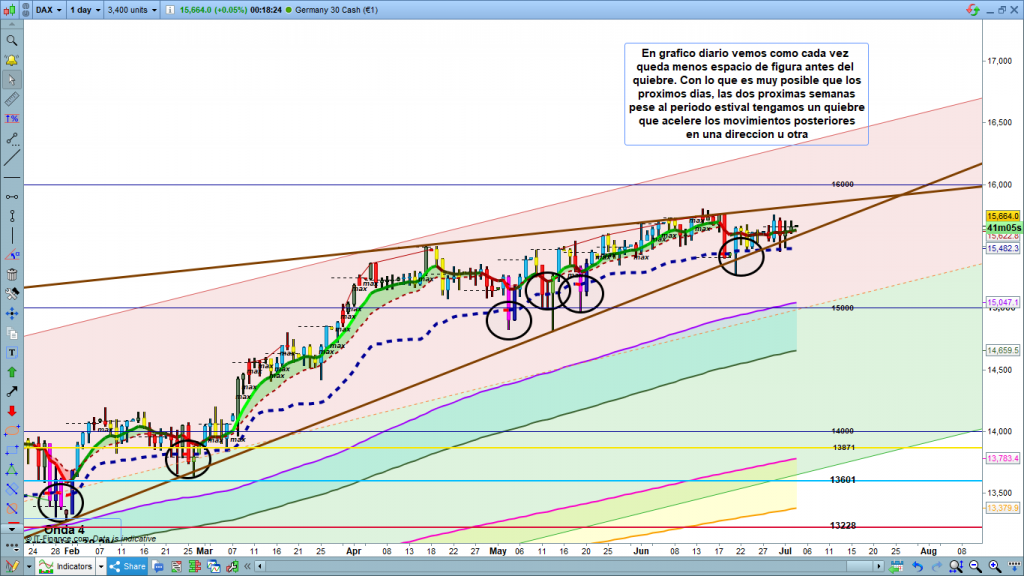 En gráfico diario del dax30 podemos ver con claridad, como el movimiento se ha ido ralentizando formando la figura de cuña marcada por las dos directrices. Al mismo tiempo vemos como la evolución dentro de la figura está muy adelantada, ya en zona de quiebre en cualquier momento. Creo que los próximos días, máximo las dos próximas semanas, tendremos un quiebre de esta zona, quiebre que debe ser confirmado en gráfico de diario, y a partir de ese momento seguro que el movimiento del índice se volverá a acelerar. Recordar que él quiebre se confirma con el cierre de dos velas consecutivas y progresivas en el otro lado de la directriz, y que en este caso en principio y teniendo en cuenta los distintos conteos puede ser tanto por arriba como por abajo.