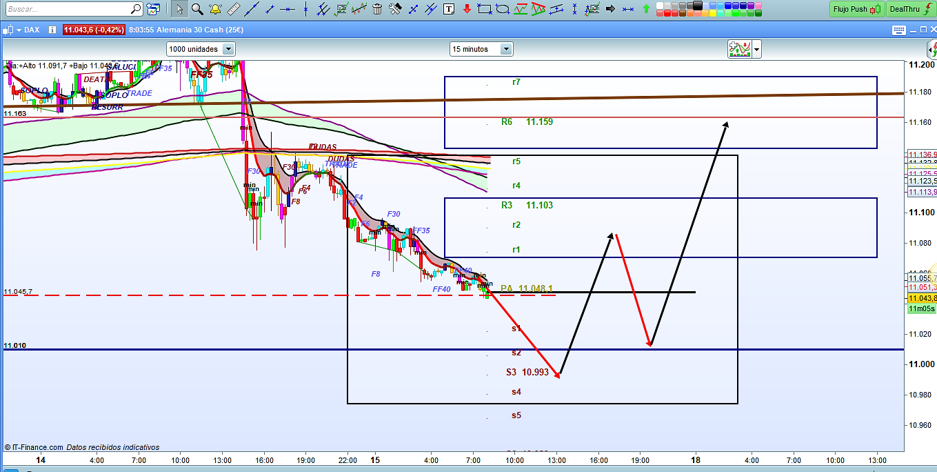 Siguiendo con el tema del análisis, una cosa es analizar y determinar la dirección de la tendencia y los objetivos posibles, y otra muy diferente operar estos movimientos. En cuanto a el análisis, si es corrección el objetivo es la zona entre 10779 y 10512, y si es impulso, dentro de muchas semanas-meses, el objetivo es 9464. Sin embargo, en la operativa para un day trading una cosa es saber dónde va, y otra muy distinta operar sacando rentabilidad de estos movimientos. Como explicaba, se trata de hacer lo mismo con los gráficos más pequeños. Sin embargo, esto es muy laborioso y para aprovechar el día tiene que estar hecho máximo a las 7:30h. Para hoy, la zona de trabajo del día es bastante amplia y viene marcada por el rectángulo negro. Recordad que la cota histórica del 11010 es muy importante y que su zona de influencia va desde 10975 hasta 11045. El día creo que se moverá entre esta zona y la zona de antiguos soportes, ahora resistencias, de la zona superior 11100, 11121, 11141 y hasta 11163.