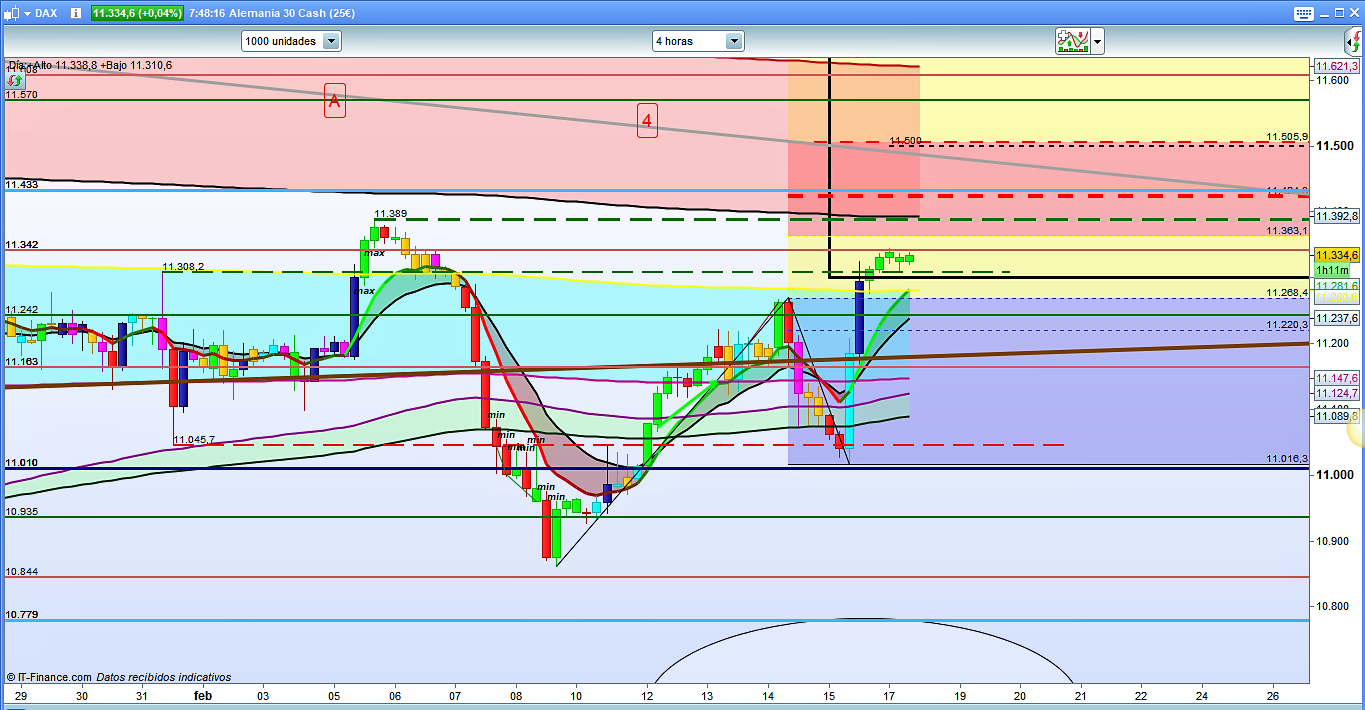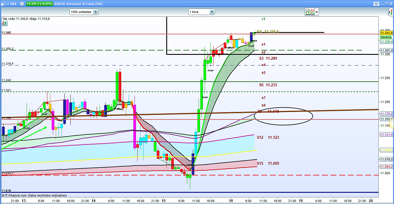 Apertura semanal del mercado sin gap significativo en la cotización dax, sesión asiática anodina y lateral. Aun siendo el mercado alcista, creo que los primeros movimientos de la sesión del Dax30 deberían ser bajada correctiva hasta la zona del 11242, o incluso, posiblemente de segundas, hasta la zona del muro compuesto por la directriz trimestral y la cota histórica del 11163, siempre teniendo en cuenta que antes aún podría hacer una pluma de nuevo máximo justo por encima de la zona del 11342.