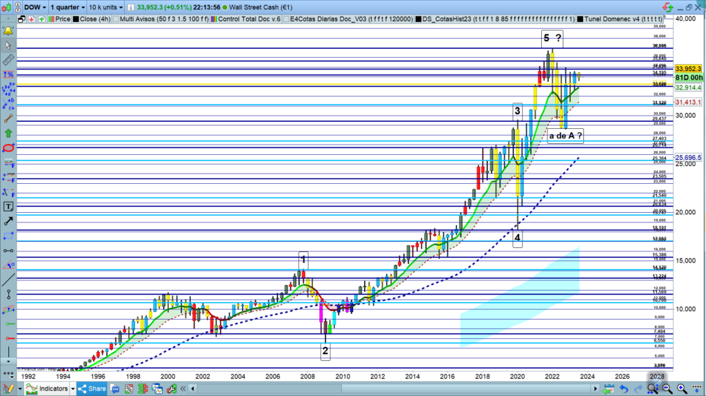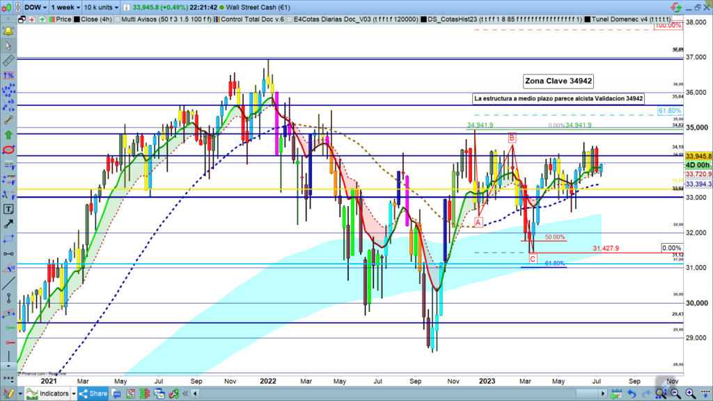 La zona clave para el Dow es la zona de los 34942, un nuevo alto confirmaría la validación menor ya realizada, e iríamos a nuevos máximos históricos.