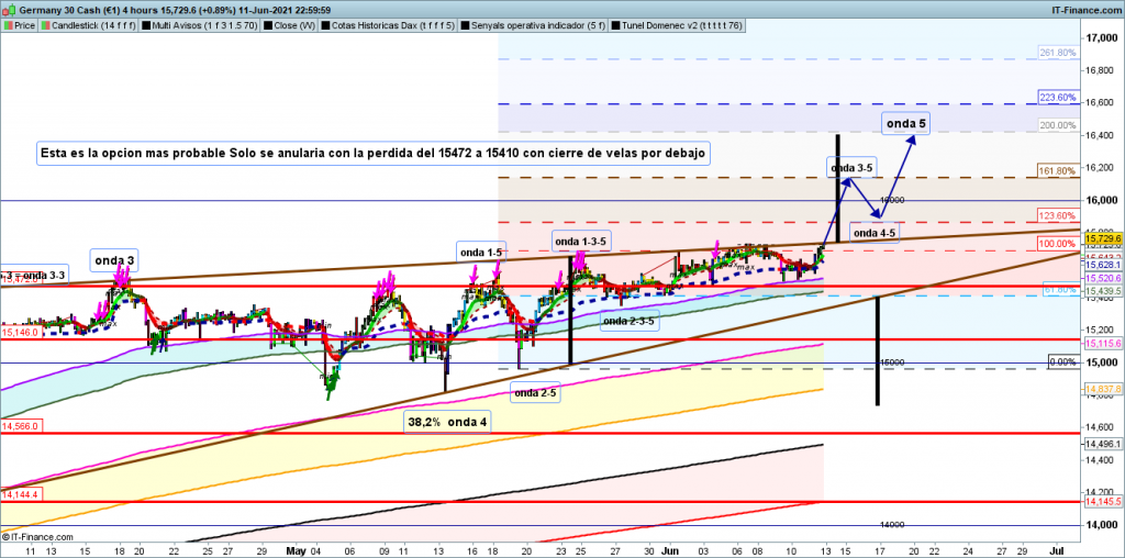 La semana pasada explicaba que la cotización dax30, se encontraba dentro de un triángulo ascendente o una cuña. Lo veíamos con claridad en el gráfico de 4 horas del dax30. Además y en el mismo gráfico marcaba un posible conteo, que dadas las circunstancias parece el más probable incluso en estos momentos. Solo la ruptura con claridad, con cierre de velas de H4 o de H1 por encima de la directriz superior, nos darían recorrido franco hasta los objetivos marcados. SI NO HAY ROTURA Y CONFIRMACIÓN de la directriz superior, no tendremos trades por encima de los 15800 puntos. Todo y lo que veamos en los conteos y proyecciones técnicas posibles.