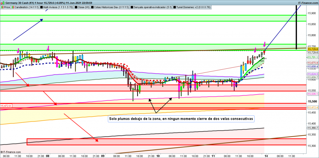 En gráficos pequeños por debajo de los gráficos diario y semanal, no se puede saber con una mínima seguridad hacia donde ira la cotización y cuando más pequeños los gráficos más difíciles son estas proyecciones, además recordemos que estamos en zona de máximos históricos, y que las posibles proyecciones de conteos en esta zona en gráficos grandes de semanal mensual etc. nos daban la zona de los 15500 a 15800 como zona posible de final del gran movimiento. aunque una pequeña pluma de 500 puntos en un gráfico mensual es muy normal, aunque a un scalper esta afirmación le pueda hacer alucinar. Si tenemos esto en cuenta los conteos realizados para Intradia, intersemanal, que deberían dar una onda 3 en 16140, y un final de movimiento entre los 16300 y los 16500, se puede cumplir, o en cambio tener un movimiento volátil como en febrero del 2020, y dejar para la historia el último conteo en cuestión. De ahí la gran importancia, independientemente de las figuras y de los conteos de disponer de las zonas más importantes que puedan actuar como SoR. Como en estas alturas no tenemos cotas históricas consolidadas, solo proyecciones matemáticas que hasta ahora han actuado muy bien deberemos disponer de esta información y de todas las zonas que podamos obtener con diferentes técnicas y en diferentes temporalidades. Así la semana pasada ya, marque unas zonas posibles que podrían actuar como SoR, o sea zonas objetivo para los trades en curso o posibles zonas de entrada en caso de ruptura y confirmación o rebote y confirmación en tempos más pequeños.