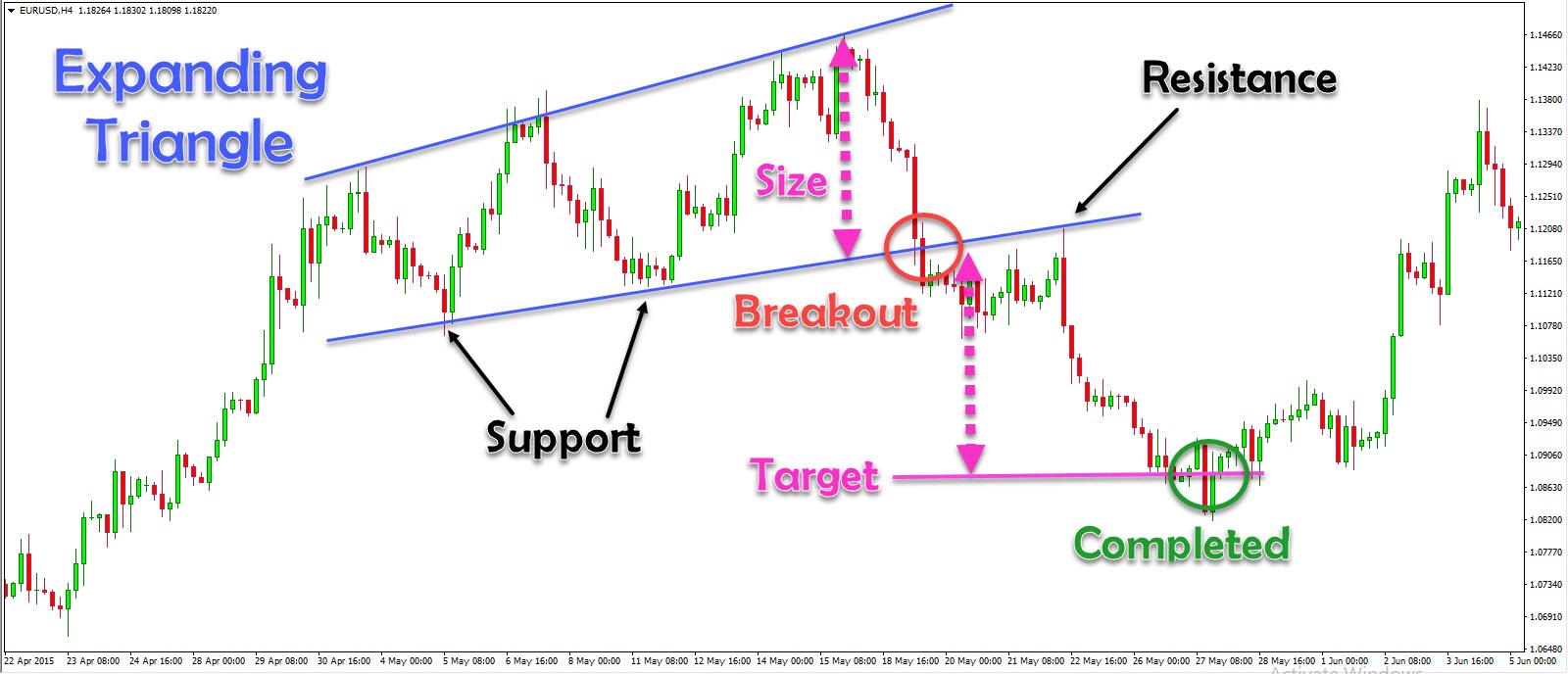 Obviamente, en el caso del triángulo expansivo descendente alcista estaríamos hablando de lo mismo pero en la parte inferior o final de una tendencia bajista. Esta figura sería un patrón de reversa claro, saliendo de la figura con un movimiento alcista, igual que en las correcciones que se puedan dar de una tendencia alcista después de hacer todo el recorrido dentro del triángulo, quebraría para continuar la tendencia alcista.