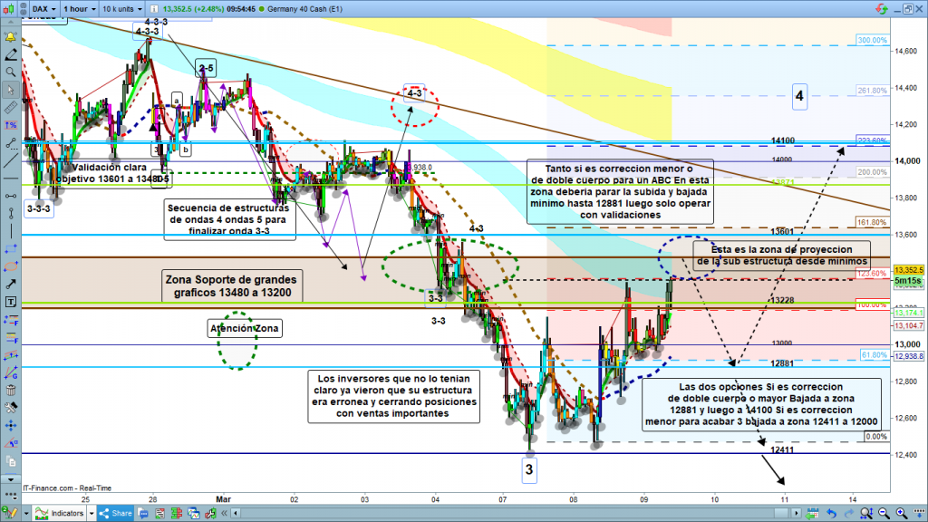 Ayer, acababa de llegar del viaje, con el cansancio no podía dormir y me puse a hacer el flash del día, pero después no lo pude acabar hasta H1. Gráfico de 1 hora para el más corto plazo. Básicamente, dos opciones, zona del actual movimiento alcanzada aunque aún podría subir un poco más hasta el 13601, que es el 161.8% de la proyección AB desde mínimos. Por tanto, zona complicada de operar en estos momentos. Si aun fuera corrección menor de solo onda 4-3, es posible que la corrección hubiera finalizado para seguir impulso hasta la zona 12411 a 12000 y acabar allí onda 3. Si, en cambio, que es lo que parece más probable, la onda 3 finalizo en la zona de los 12411, ahora estaríamos en onda 4 con corrección de doble cuerpo. Si este es el movimiento finalización del actual impulso en zona marcada entre el 123,6% y el 161,8%, bajada a zona de 12881, probablemente, y nuevo cuerpo de 5 ondas hasta los 14100. Atención que estos días hay alta volatilidad, y recordad en todo momento que la zona 13480 a 13200 es zona de fuerte soporte/resistencia de grandes gráficos. Suerte