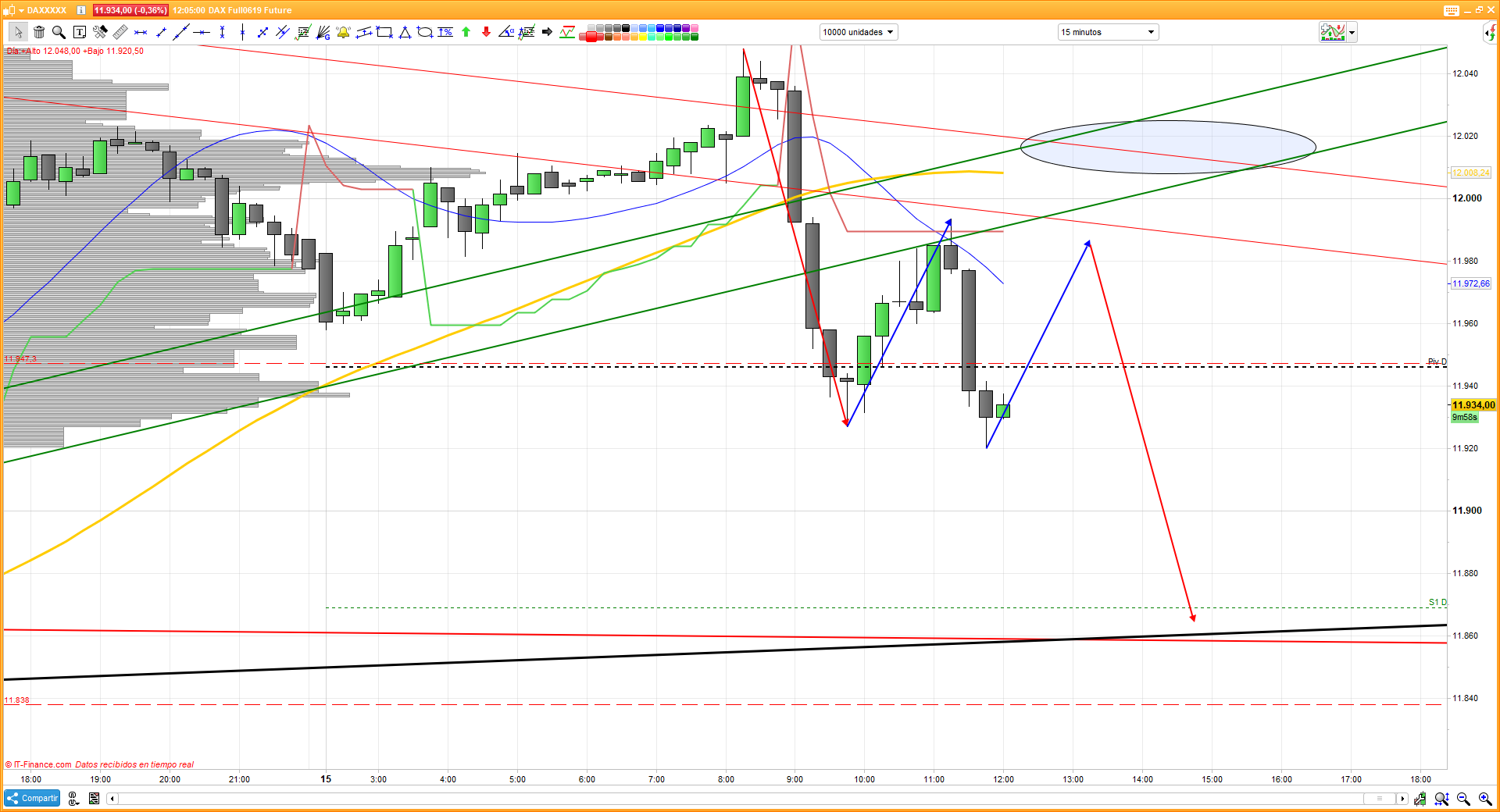 Me gustaría poder plantear escenarios en casos de rotura de zonas, pero de momento el soporte de 11.933 se está haciendo grande, pero tiene pinta de querer ir a buscar por segundo bajista desde la apertura de las 9 los 11.867 puntos.