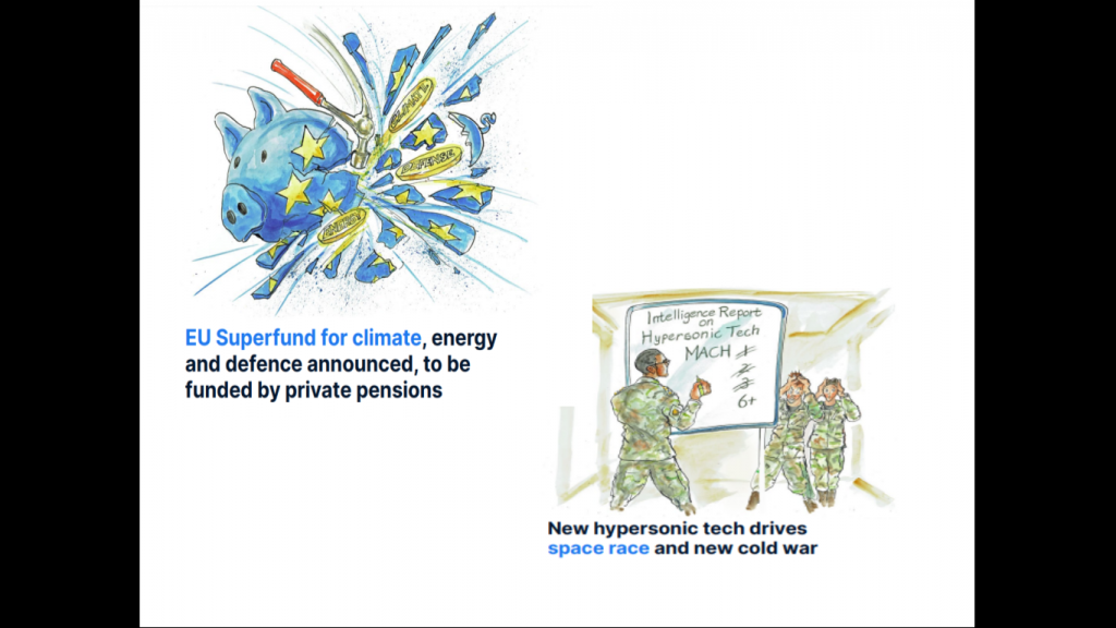 Para defenderse del populismo, profundizar el compromiso climático y defender sus fronteras a medida que retrocede el espectro de seguridad de EE.UU., la Unión Europea lanza un Superfondo de US$3 billones que se financiará con asignaciones de pensiones en lugar de nuevos impuestos. Los rendimientos de los bonos se armonizan, y las empresas de defensa y nuevas energías tienen el mejor desempeño.