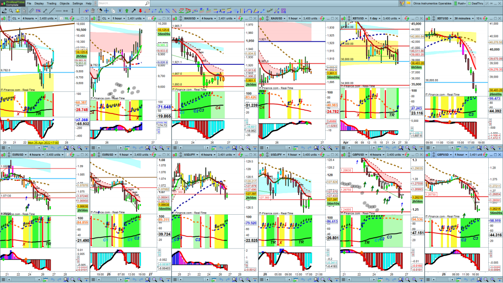 El fin de esta sección es la de conocer que instrumento, de los más activos, es operable en un momento determinado, porque hay fuerza en el mercado y, por tanto, tiene recorridos significativos. Además de la información imprescindible del gráfico, a nivel de cotas históricas, soportes/resistencias e indicadores, cada instrumento va acompañado de dos osciladores. Un oscilador que marca la fuerza, o falta de ella, en un instrumento en un momento determinado, y otro oscilador que marca la tendencia del momento y estructura en curso para ayudar en la toma de decisiones.
