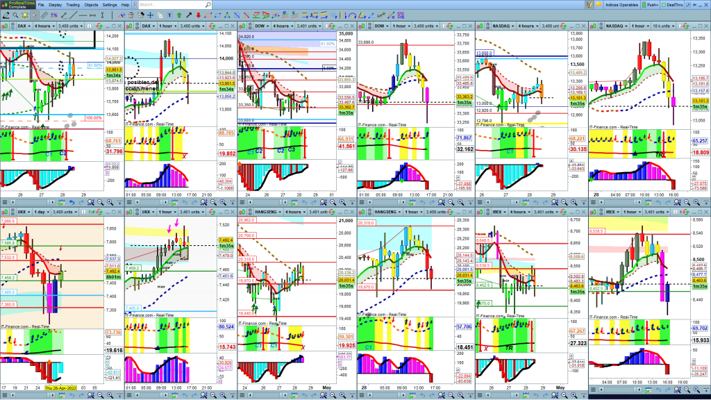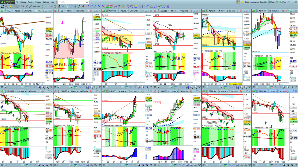 El fin de esta sección es la de conocer que instrumento, de los más activos, es operable en un momento determinado, porque hay fuerza en el mercado y, por tanto, tiene recorridos significativos. Además de la información imprescindible del gráfico, a nivel de cotas históricas, soportes/resistencias e indicadores, cada instrumento va acompañado de dos osciladores. Un oscilador que marca la fuerza, o falta de ella, en un instrumento en un momento determinado, y otro oscilador que marca la tendencia del momento y estructura en curso para ayudar en la toma de decisiones.