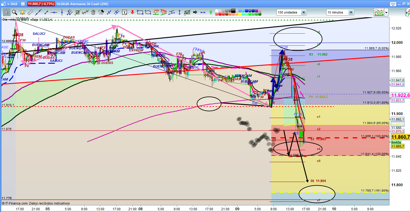 Por encima de 11910, muy posible que la primera opción de impulso de 5 ondas esté finalizado y tengamos una corrección importante hacia arriba, hasta la zona del 11960 como mínimo. En el caso de que haga un patrón de quiebre-confirmación, ya lo ha hecho, y ahora continuara bajando, tendríamos un 70% de probabilidades de que el movimiento siguiera hasta 11779. Sin embargo, tened en cuenta que también podría ser sólo un nuevo mínimo, pequeño, para acabar el impulso de la primera opción, y desde allí saliera hacia arriba. Por lo tanto, SL ajustado si ocurre y, sin perder el equipo de vista. La perdida máxima no puede ser superior a 25 puntos por ningún motivo.