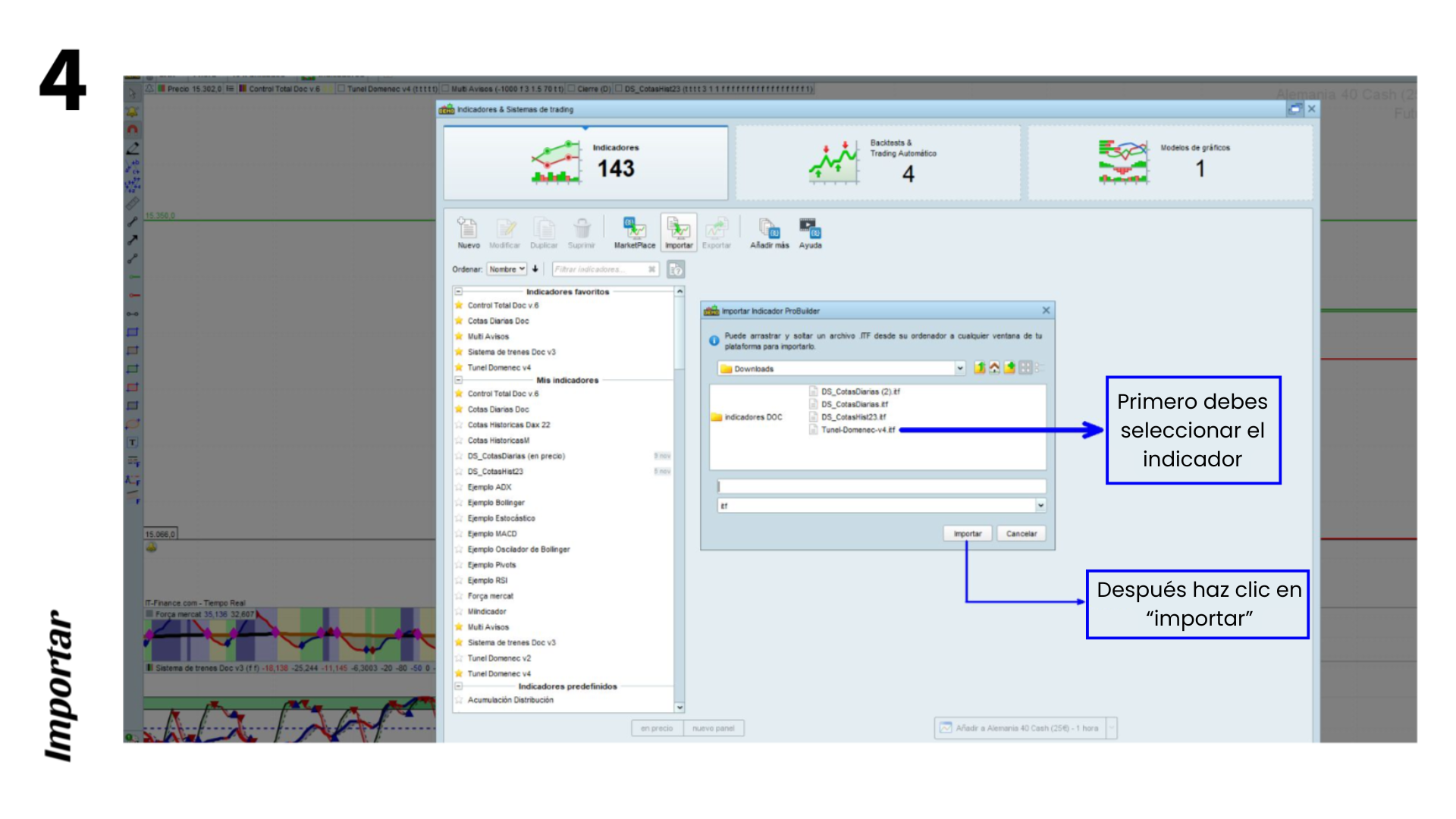 Primero debes seleccionar el indicador que deseas importar desde la ventana emergente.
